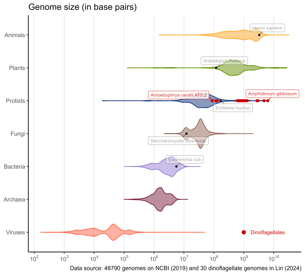 Among the 48 790 organisms listed in the data, I only found 4 dinoflagellates (I may have missed some). Because dinoflagellate genomes are notoriously big, and because they are quite strange, only a few genomes have been sequenced, and most of them very recently. Fortunately for me, Lin (2024) recently published a review article on dinoflagellate genomics. In his Table 1, he lists the published sequenced genomes of dinoflagellates and their size (in millions of bp, Mbp). How convenient for us!