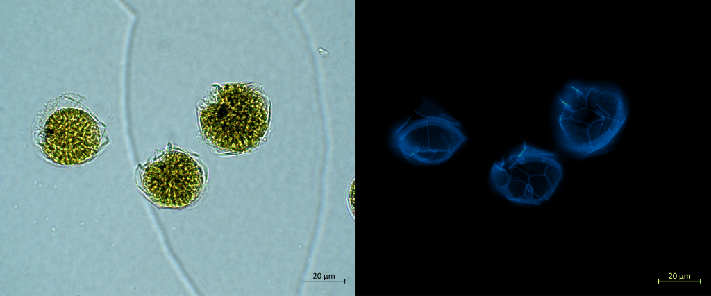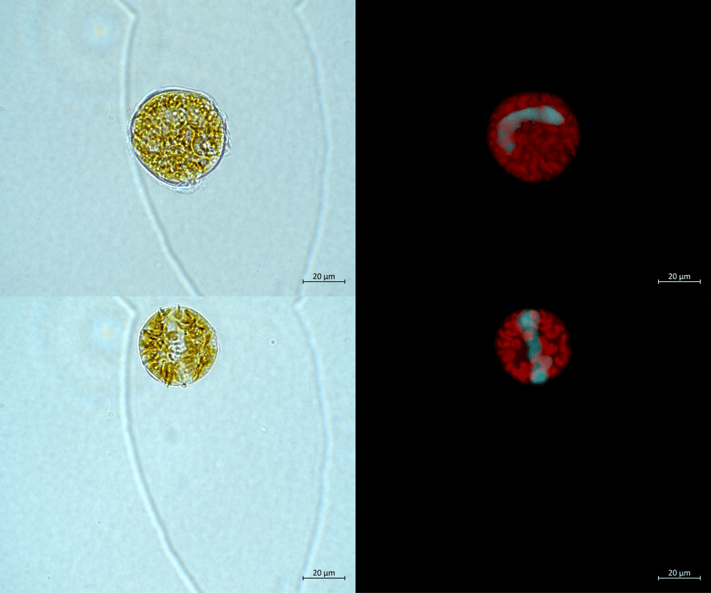 Beneath the theca is the heart of the cell, where the organelles lie and the magic of biology operates. After a drop of SYBR green and an excruciating 30-minute wait, I was ready to shoot some nuclei and chloroplasts! As so often with dinos, this microscopy session did not disappoint.