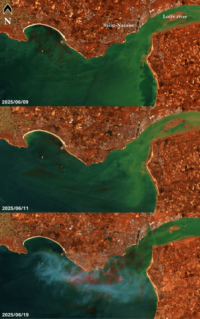 When I wrote last month’s post, I didn’t expect it to be relevant this soon, yet you will see that it is a fitting introduction for this one! A few days ago at the beginning of June, while scrutinising Sentinel-2 images of the Loire river turbid plume, my PhD supervisor spotted red patches in the sea. See for yourself: