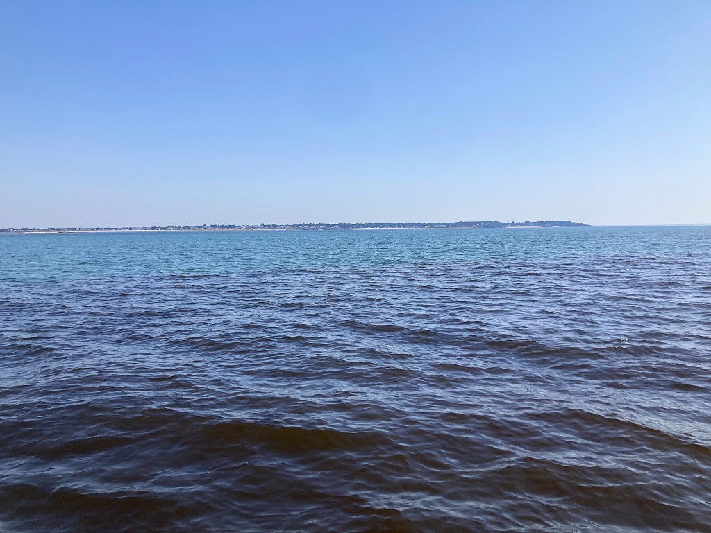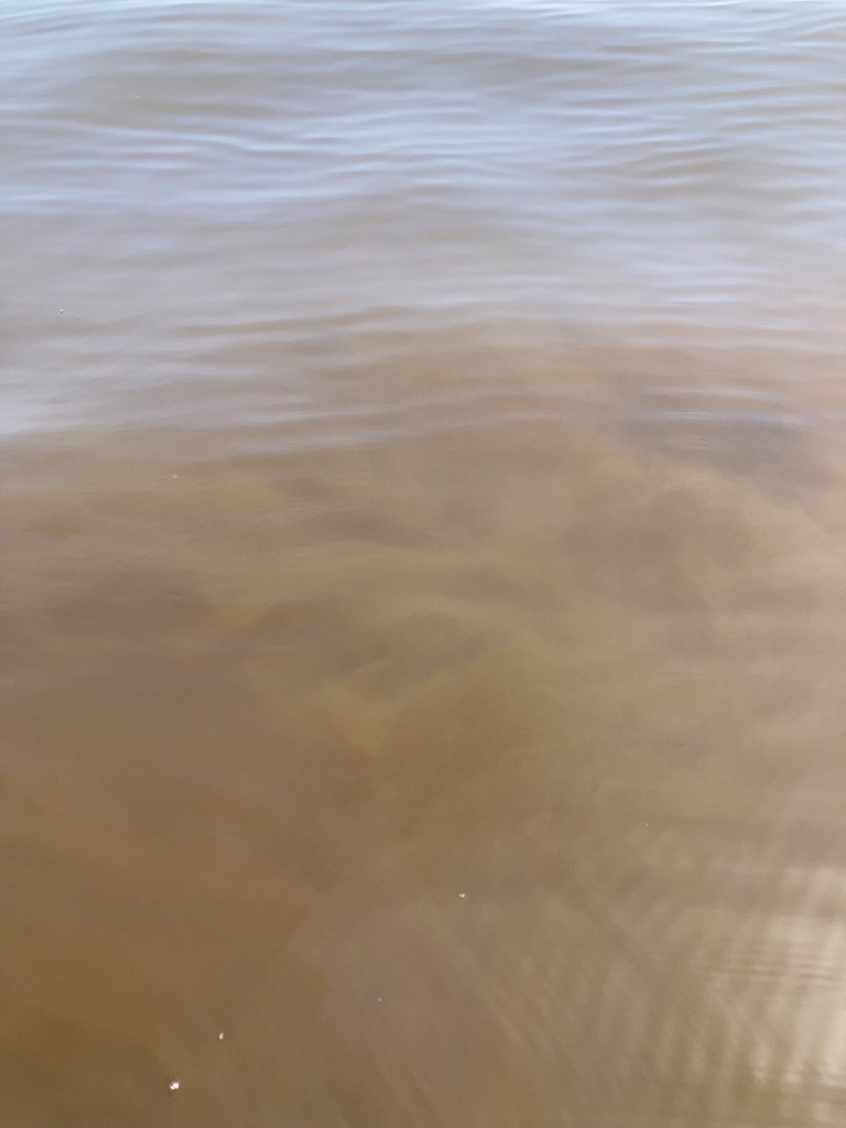 In the sunny morning of June 20th, we left the charming port of Le Croisic and went South then East to try to find some patches of coloured seawater. And patches we found! The water looked like black tea. Here is a photo where you can see the frontier between the patch and “normal” waters in the background, if you squint a little: