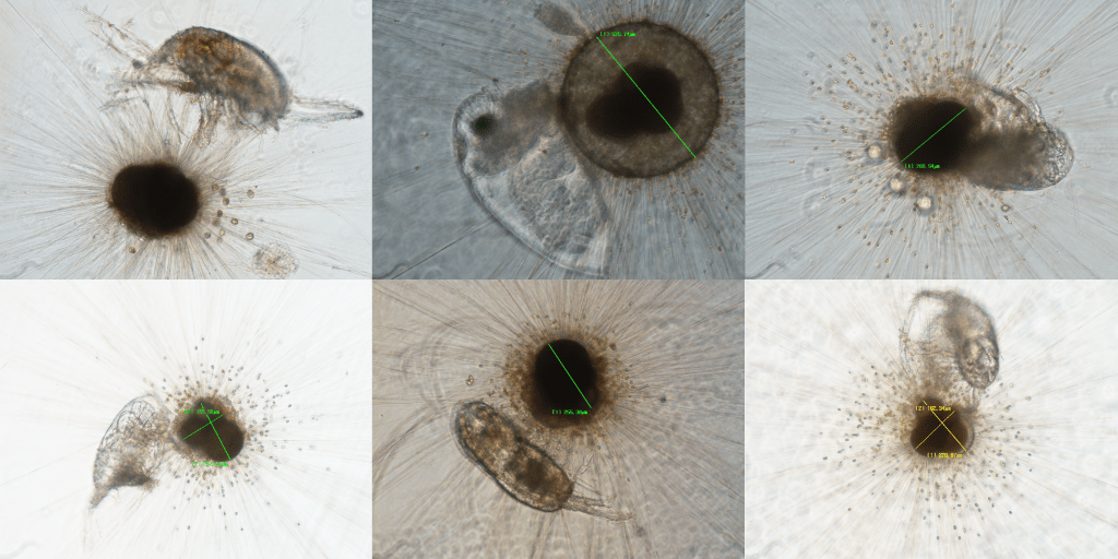 This is quite a compelling story isn’t it? However, we’re not sure it’s how it happens in reality. We know for sure that Orbulina preys on zooplankton, but are they attracted by the exudates of the symbionts? Some clues point towards this direction: O. universa cells in the wild are often found with copepods trapped in their pseudopods, in proportions apparently exceeding what would be expected if the encounters occurred by chance. We can therefore think that the foram attracts its prey through some mechanism, and the photosynthetic excess products are a good candidate. But we have no hard data or direct observation that proves it.