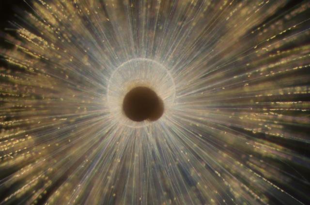 Orbulina universa is a planktonic foraminifer, living in symbiosis with the photosynthetic dinoflagellate Gymnodinium béii. The symbionts are hosted within a crown of pseudopods, hair-like thin extensions of the foram’s cell membrane. The darker host cell surrounded by the bright, minute symbionts somewhat resembles a beautiful supernova, hence its name (probably):