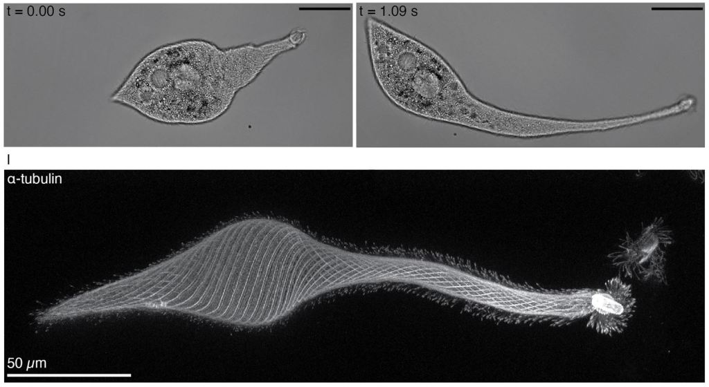 Lacrymaria olor is a ciliate that extends its “neck” 30 times its body length to hunt prey, in a matter of seconds. It does that by folding and unfolding its cytoskeleton like origami: